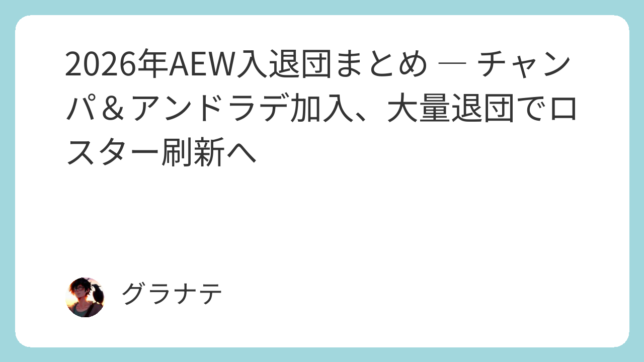 退団者の顔ぶれを見ると、スタークスやホッブスなど「使い切れなかった才能」が多い印象。一方で、チャンパやアンドラデといった即戦力の加入は心強い。特にチャンパはデビューからTNT王座戴冠までのスピード感が凄まじかった。女子部門の補強も着々と進んでおり、2026年のAEWは「量より質」のロスター運営に舵を切った年として記憶されるかもしれない。